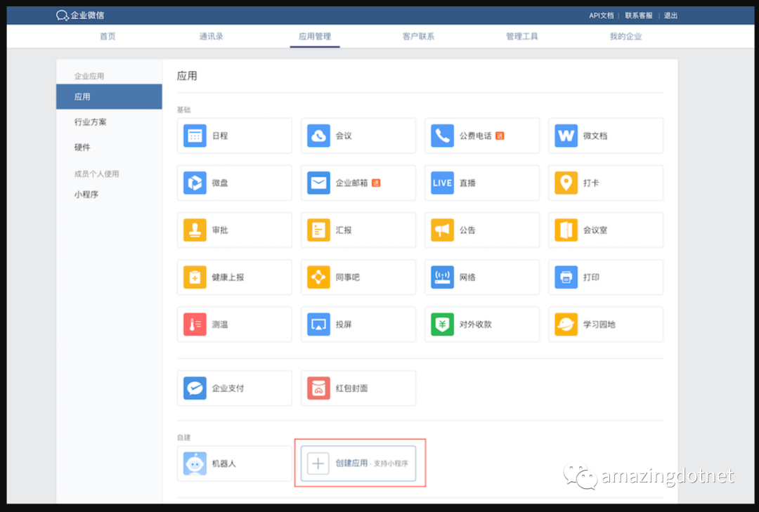 注册成功后,点「管理企业」进入管理界面,选择「应用管理」 → 「自建」 → 「创建应用」