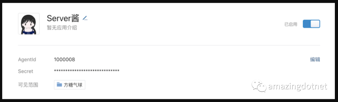 创建完成后进入应用详情页,可以得到应用ID( agentid