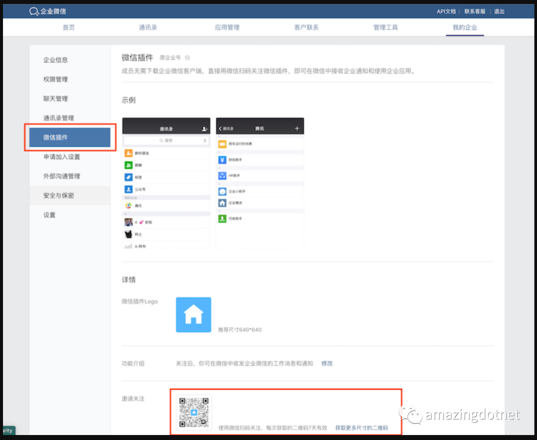 进入「我的企业」 → 「微信插件」,拉到下边扫描二维码,关注以后即可收到推送的消息。
