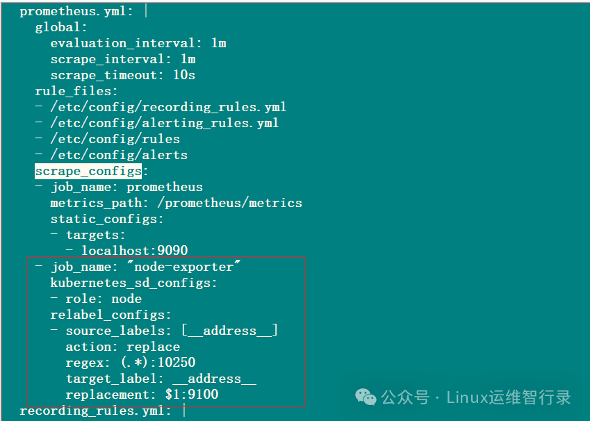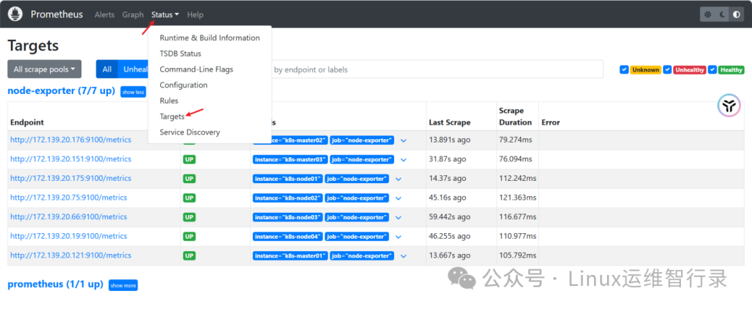 所有服务的Exporter部署后,都需要去Prometheus配置上采集Exporter指标数据。上述部署Node Exporter服务,所以需要在Prometheus采集Node Exporter指标。