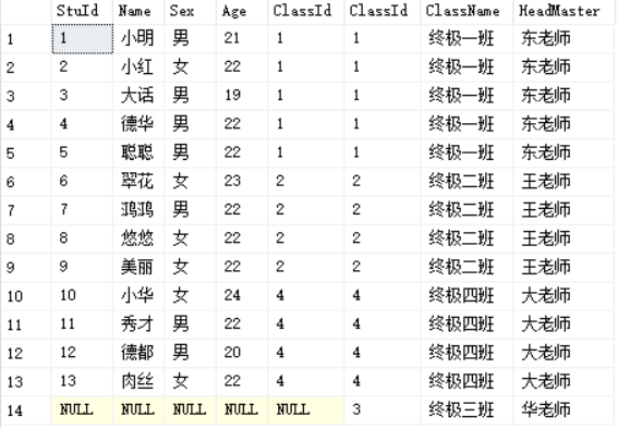 select * from Students s left join Class c on s.ClassId=c.ClassId