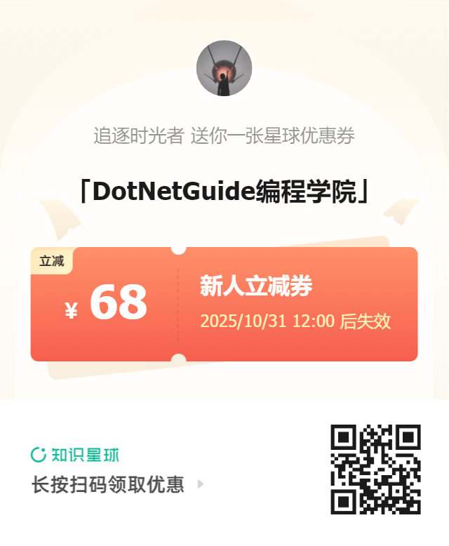 大姚发放了100张DotNetGuide编程学院知识星球68元新人立减优惠券,有兴趣的小伙伴可以领券加入(当前应该是星球最优惠的阶段),加入后如果感觉不值得,3天内知识星球APP右上角退出,直接全额退款,无任何套路!