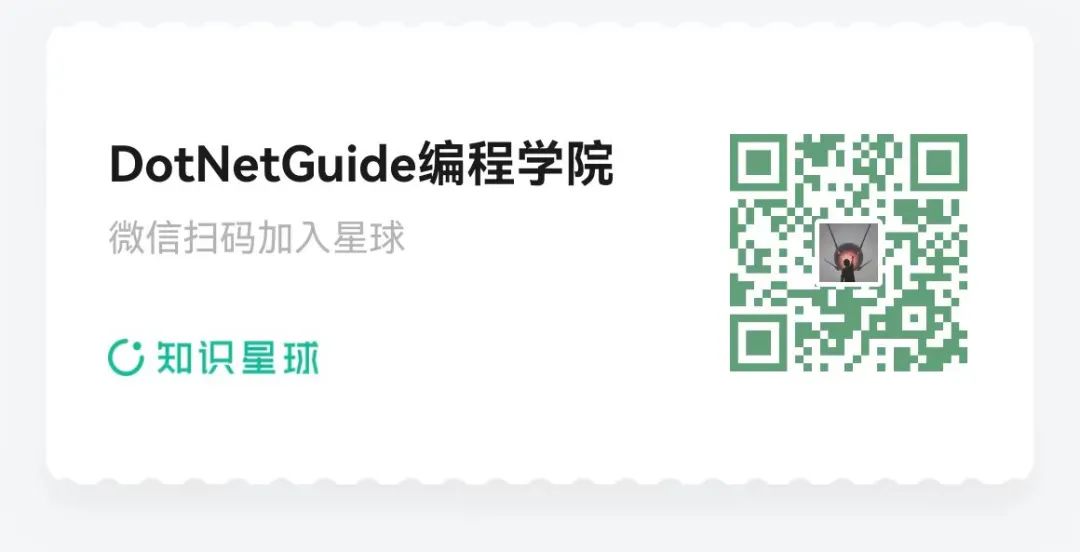 DotNetGuide编程学院是一个专注于C#/.NET/.NET Core学习、工作、面试干货和实战教程分享的知识星球!当然这里不仅仅只有C#/.NET/.NET Core还有前端、云原生(Docker,K8s)、分布式,微服务、实用工具、学习书籍、AIGC、AI赋能、求职和招聘资讯、热点资讯等多个领域,我们致力于构建一个积极向上、和谐友善的.NET技术交流、学习平台。无论您是初学者还是有丰富经验的开发者,我们都希望能为您提供更多的价值和成长机会。