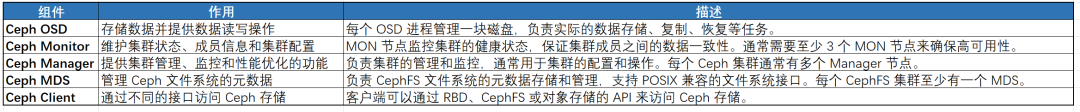 Ceph Monitor (MON):维护集群的状态,包括集群配置、成员信息以及映射信息。每个 Ceph 集群通常有 3 个或更多 MON 节点来确保高可用性。Ceph Manager (MGR):提供集群的管理、监控和接口功能。MGR 通常是集群的管理节点,负责集群的健康监控和性能调优。Ceph MDS (Metadata Server):为 CephFS 提供文件系统的元数据管理。每个 CephFS 都需要至少一个 MDS。Ceph Client:访问 Ceph 存储的应用程序或系统,如虚拟化、备份系统、Web 服务等。3.Ceph 安装步骤