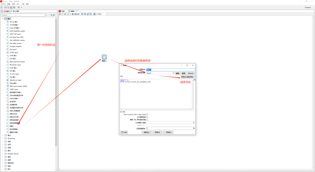 连接数据库可参照之前一篇文章数据中台ETL工具:Kettle教程(一),连接好数据库后,第一步先从数据库中拉取数据。如下图,即可预览数据库的数据。