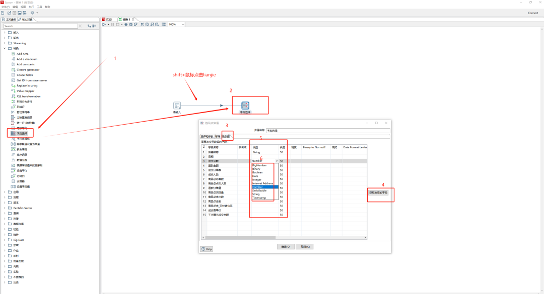选择字段选择组件,对自己的字段进行字符类型的选择,即可完成数据类型的转换,作者此处的数据员成交金额之类全部为string类型,需要转换为Number类型,选择好以后确定即可以完成字符类型转换。后面的精度和格式可以更换选择你需要的数据格式,可以自行查看实验。