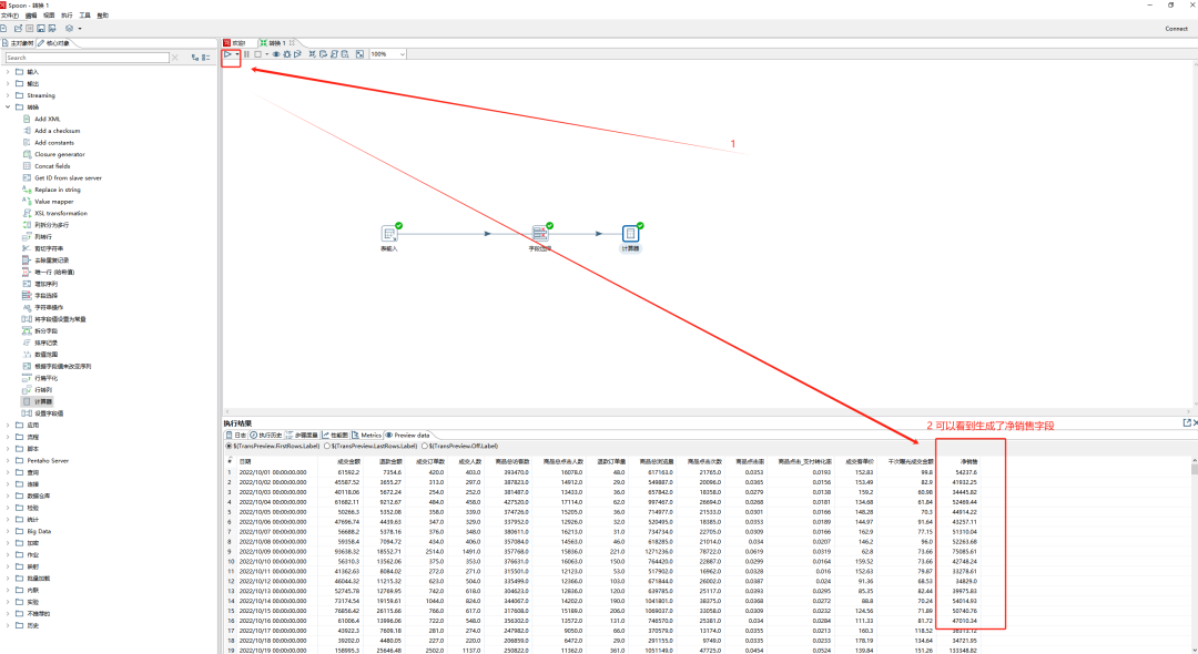 示例,如我需要计算出新的字段:净销售,应该用成交金额-退款金额=净销售,拉出计算器组件,选择填入新字段的名称和计算公式,选择好计算的字段和最后的数据生成格式。执行可以看到生成了净销售字段。