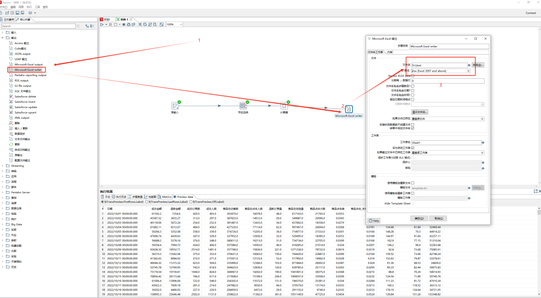 拖拽Microsoft Excel writer组件,如图设置,点击执行就可以在设定路径下看到生成的excel表格