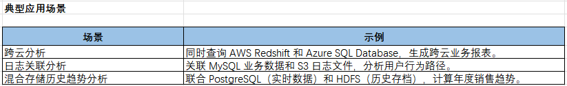 SELECTcassandra://user_behavior.user_id AS user_id,-- 从Cassandra计算行为频率COUNT_IF(cassandra://user_behavior.event_type = 'click') AS click_count,-- 从S3的CSV加载用户画像s3://profiles/user_details.csv.age AS age,-- 从PostgreSQL计算历史订单均值AVG(postgresql://orders.amount) OVER (PARTITION BY user_id) AS avg_order_amountFROMcassandra://user_behaviorLEFT JOIN s3://profiles/user_details.csvON user_behavior.user_id = user_details.csv.user_idLEFT JOIN postgresql://ordersON user_behavior.user_id = orders.user_idWHEREcassandra://user_behavior.timestamp >= '2023-01-01';