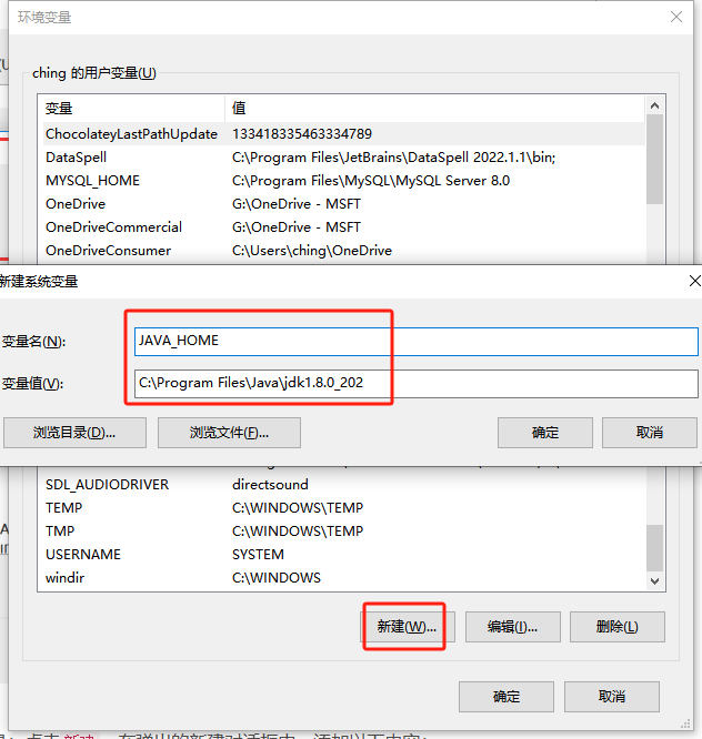 变量名:JAVA_HOME变量值:C:\Program Files\Java\jdk1.8.0_202