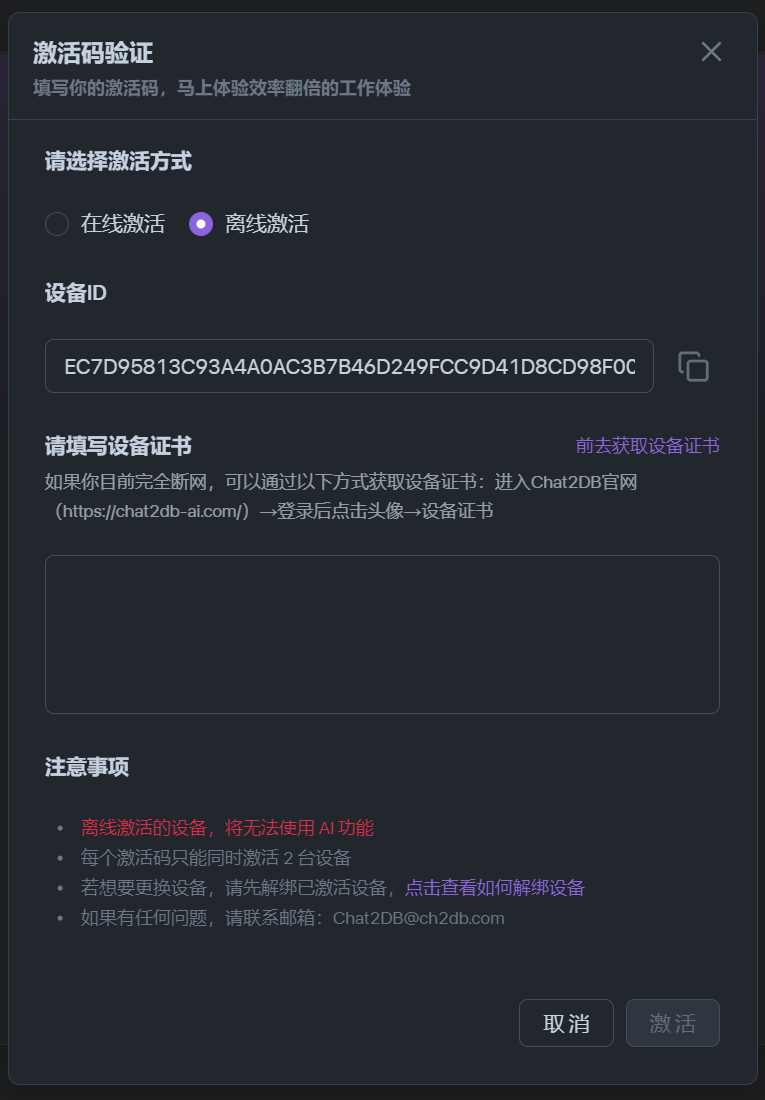 久等了!Chat2DB Local 1.2.0 版本现已支持离线激活,各位纯内网环境工作的小伙伴可以安心下单激活使用了!