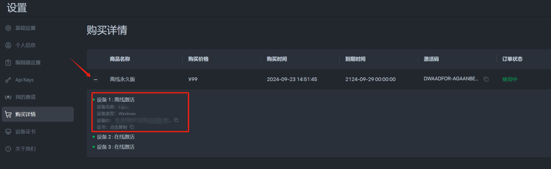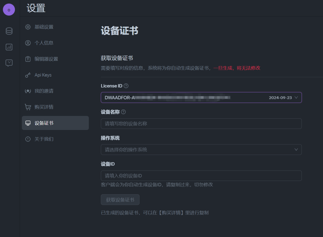 前往网页端登录->设置->购买详情,即可查看之前生成的设备证书。