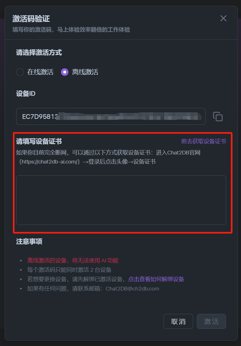 注意:如果通过离线激活方式完成激活,那么之后即使在联网情况下也无法使用AI功能。如需使用,请先前往客户端后台解除设备证书进行解绑,再通过在线激活进行激活。但是之前生成的证书不会撤回,即激活次数不会恢复。