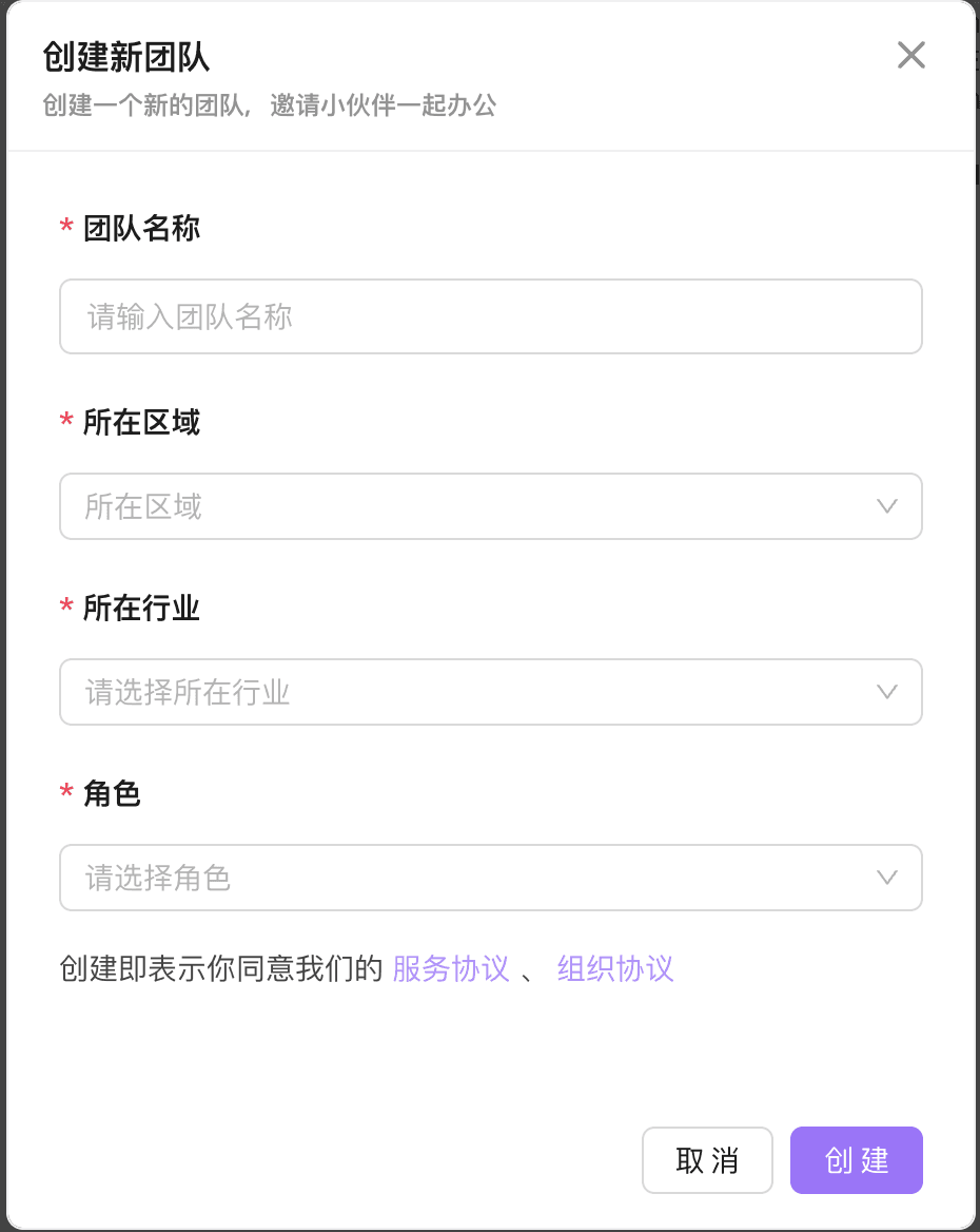 :填写组织名称、区域、行业以及角色,点击创建