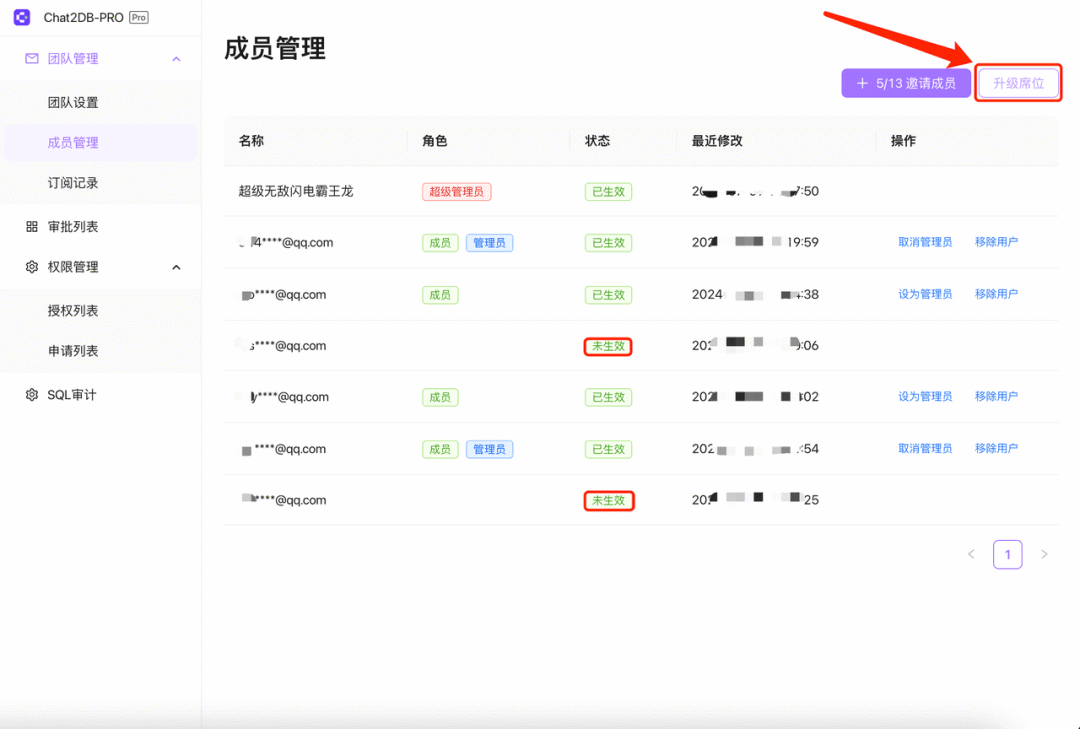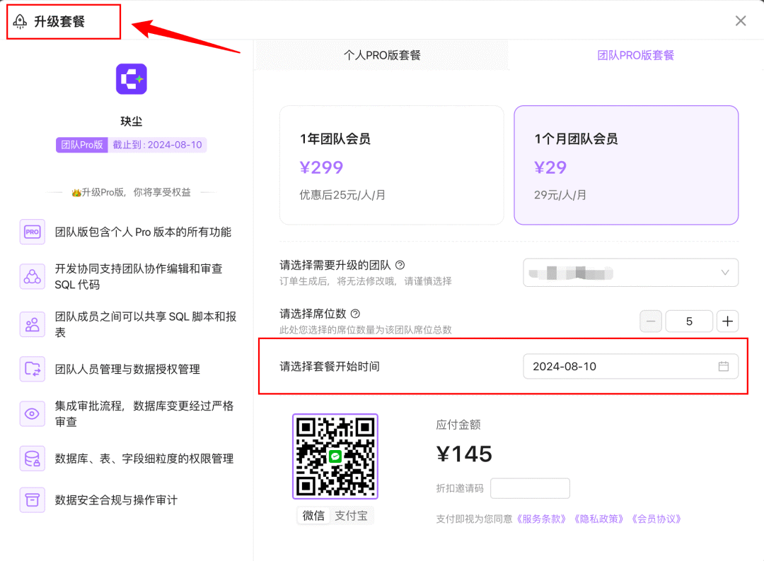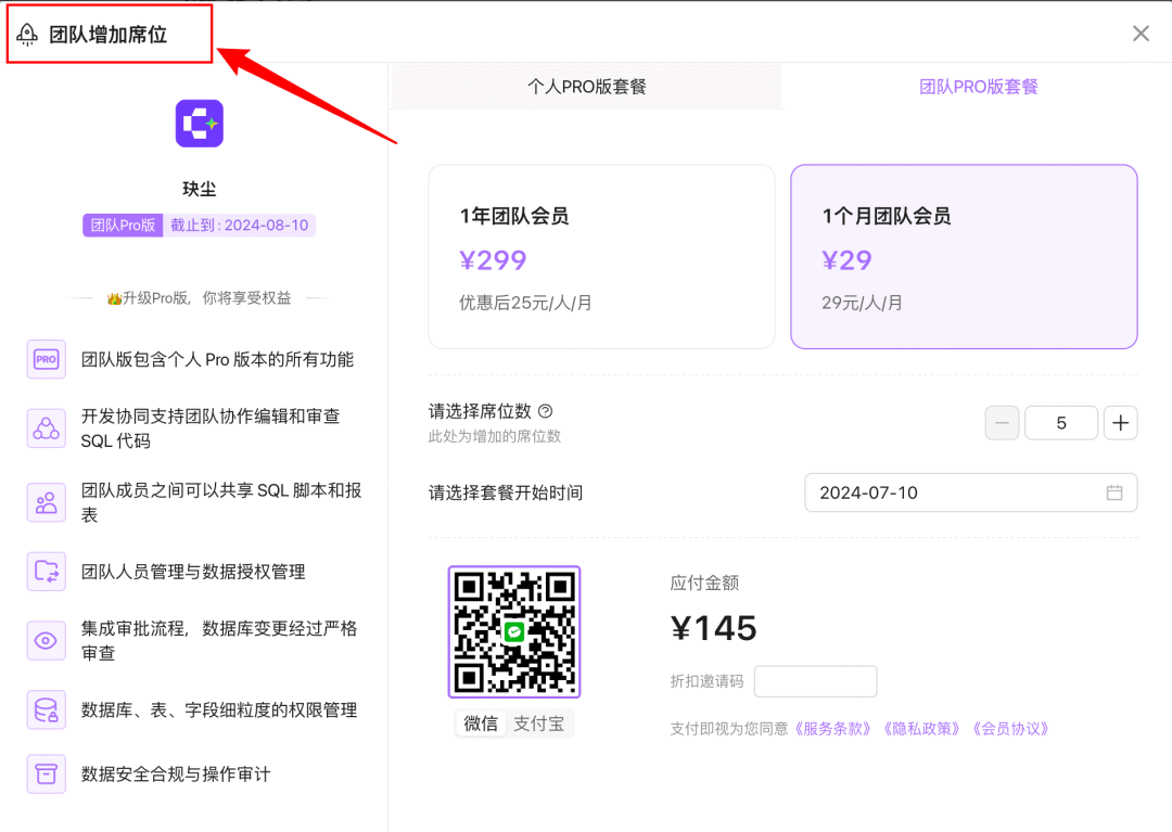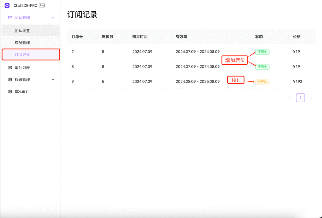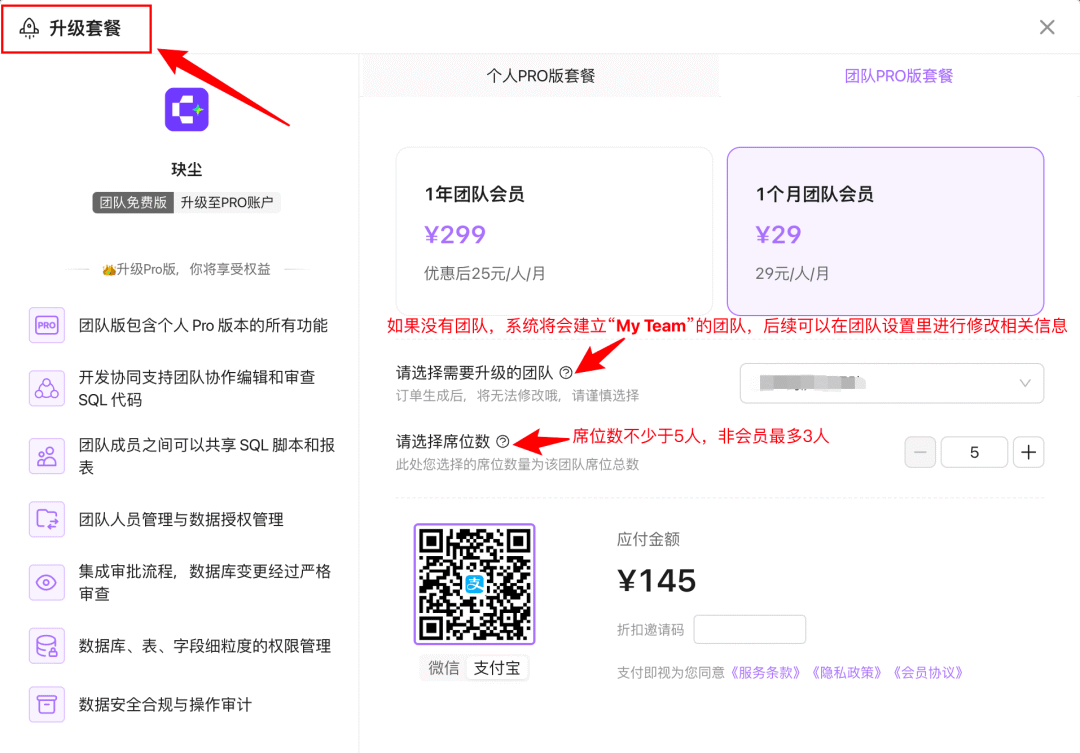 订阅计划:可以升级团队PRO套餐,邀请更多成员加入!所有成员都可升级套餐!订阅席位数最低不少于5人!(这里并不是在原有3人席位基础上增加5人,而是总席位数为5人)