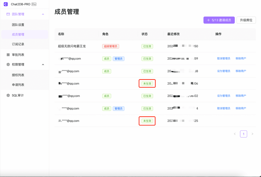 查看成员列表:查看团队中所有成员的详细信息。超级管理员可以看到审批中还未加入团队的成员(显示未生效)。