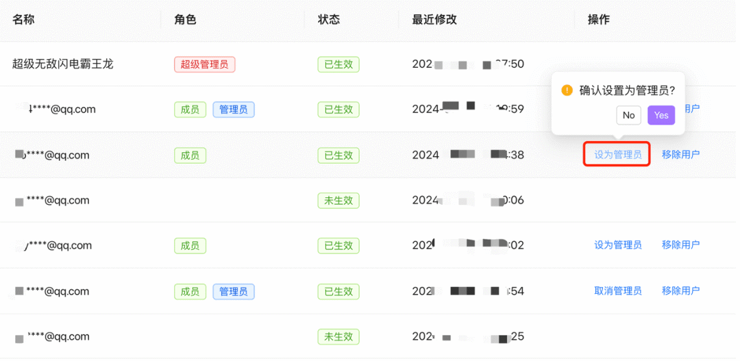 编辑成员信息:超级管理员可将普通成员设置为管理员,也可以取消管理员资格。
