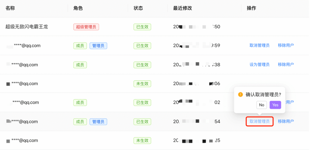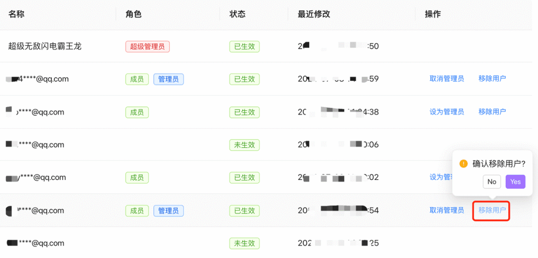 移除用户:只有超级管理员和管理员才可从团队中移除某个成员。无法移出还未加入团队的成员,即未生效的成员。