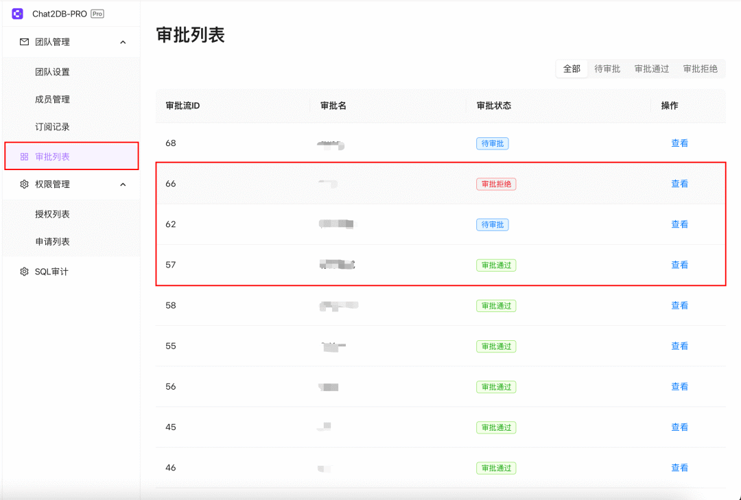 审批列表模块用于处理和审核团队成员的各项申请,包括申请加入团队,申请数据权限等。审批列表包含以下列: