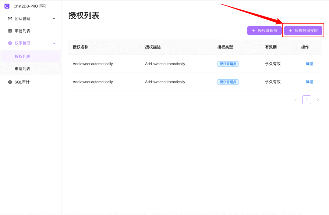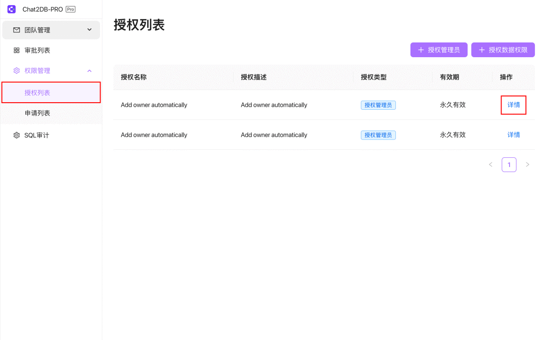 授权列表用于查看和管理团队成员已授予的权限。用户可以进行以下操作: