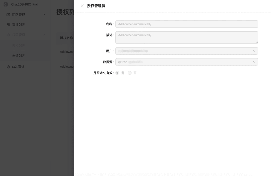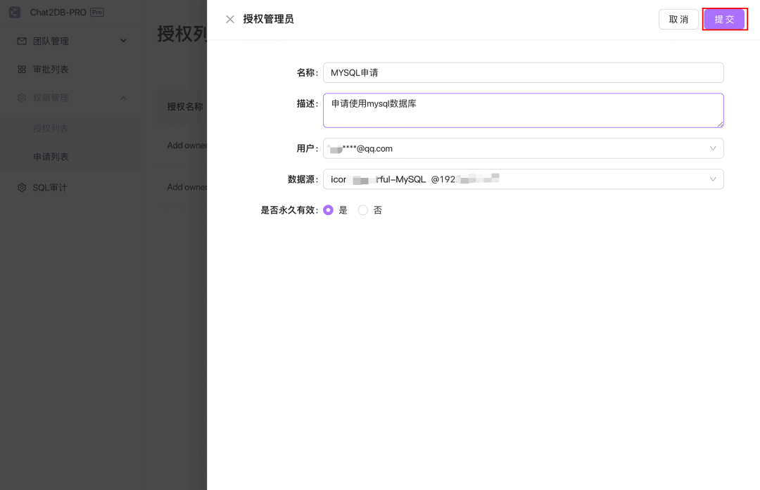 授权管理员:只有超级管理员和管理员可以选择需要授权的用户,用户需要访问的数据源以及权限是否永久有效。点击
