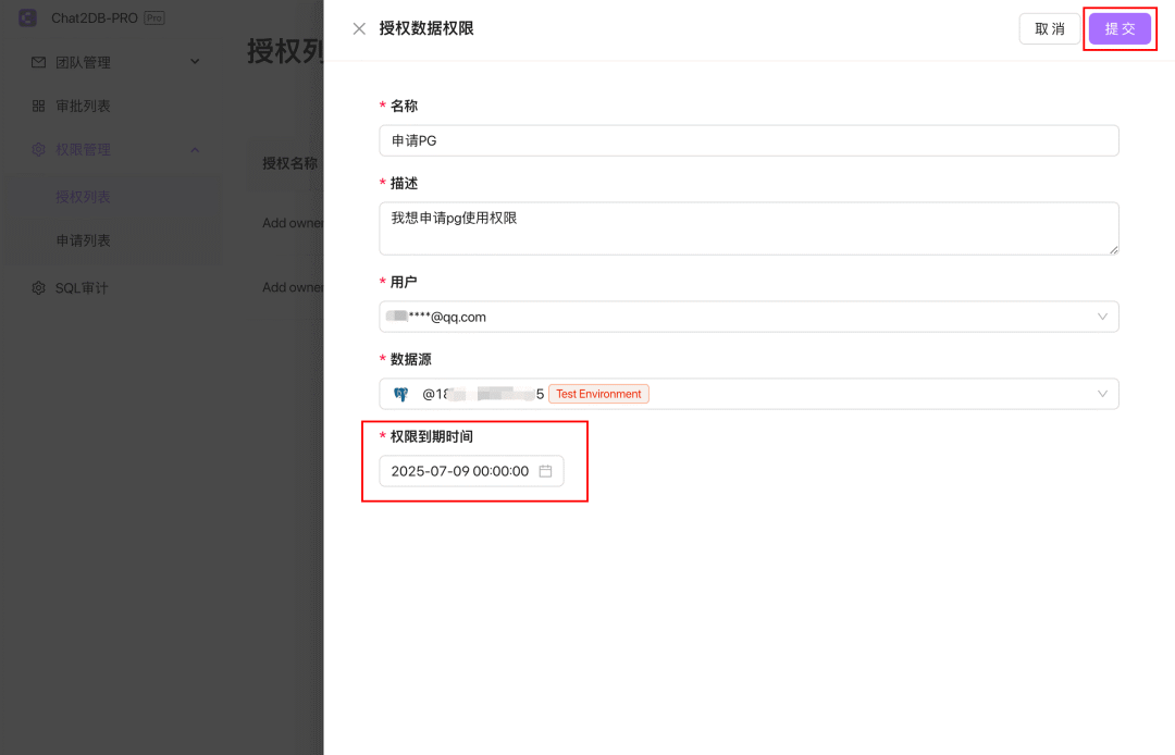 授权数据权限:只有超级管理员和管理员可以选择需要授权的用户,用户需要访问的数据源以及权限到期时间。点击
