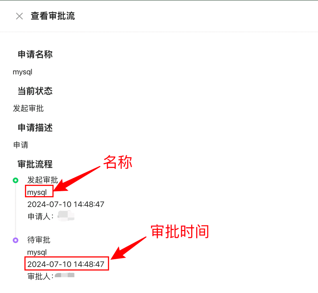 审批状态:显示当前审批请求的状态(例如:待审批、审批通过、审批拒绝)。