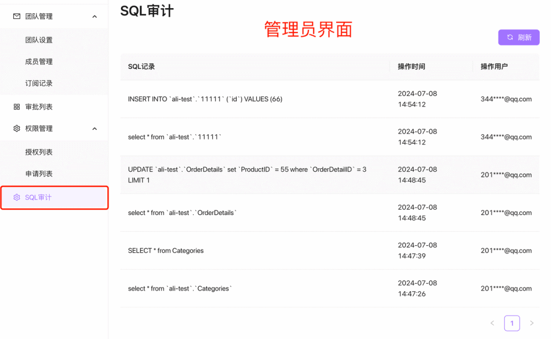 SQL 审计模块用于审查团队成员的 SQL 操作记录。超级管理员和管理员可以在此查看所有成员执行的 SQL 记录及其操作时间、操作用户详细信息。普通成员无权查看。