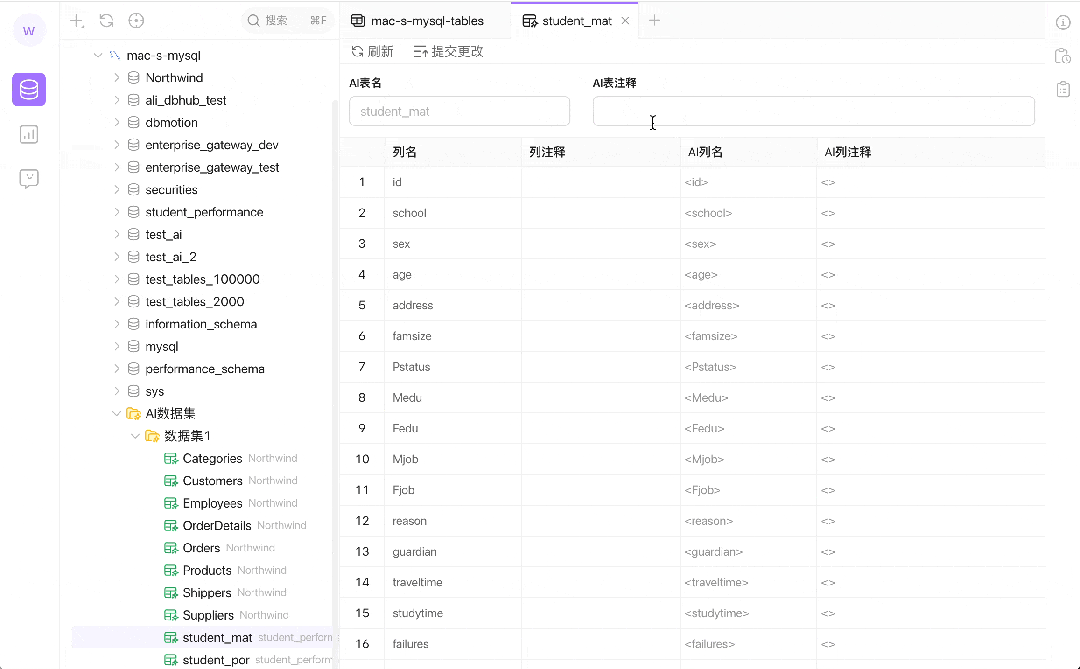 在 Chat2DB 中新引入了“AI 数据集”概念。这一功能允许用户自定义数据集并对数据进行重新标注,从而提高 AI 模型在生成 SQL 语句时的准确性和适应性。这种自定义和标注的过程是独立于底层数据库结构的,专门为 AI 生成过程设计,不会影响原始数据表的结构和存储。