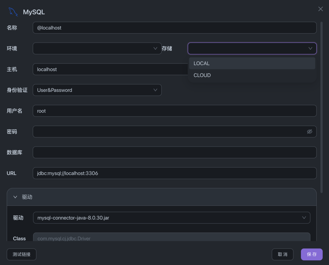 为了让大家对数据库数据的绝对放心, 我们支持了本地存储数据库连接。存储本地后数据库连接无法共享还请大家根据合适的场景选择如何存储。存储LOACL代表本地,CLOUD代表云端,默认采用本地。