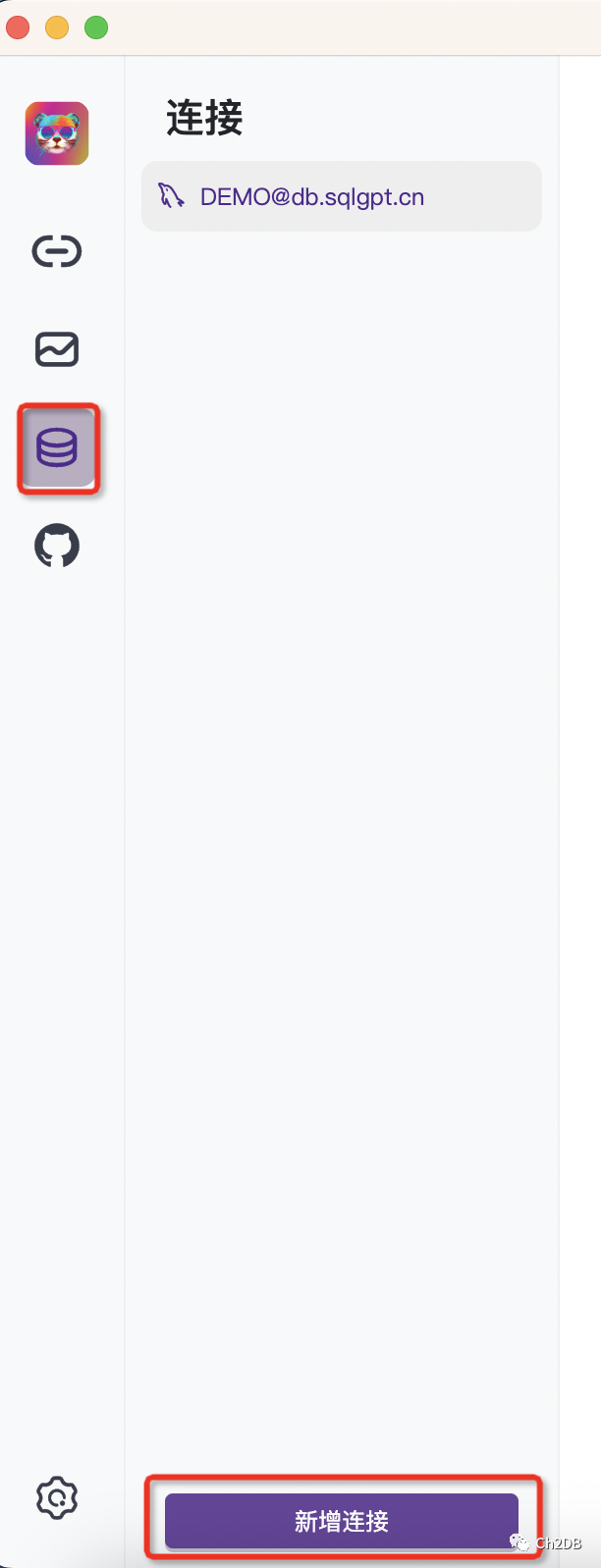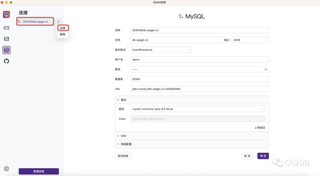 打开Chat2DB,点击左侧的“连接”按钮,选择“示例数据库”,右键点击“连接”按钮或双击,即可连接到示例数据库。