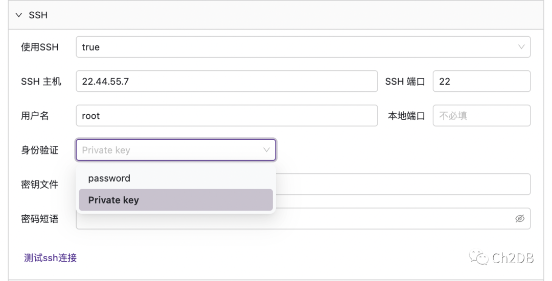 如果数据库需要通过SSH隧道连接,可以选择使用SSH true 配置SSH隧道信息,点击“测试SSH隧道”按钮,如果连接成功,说明SSH可以链接。