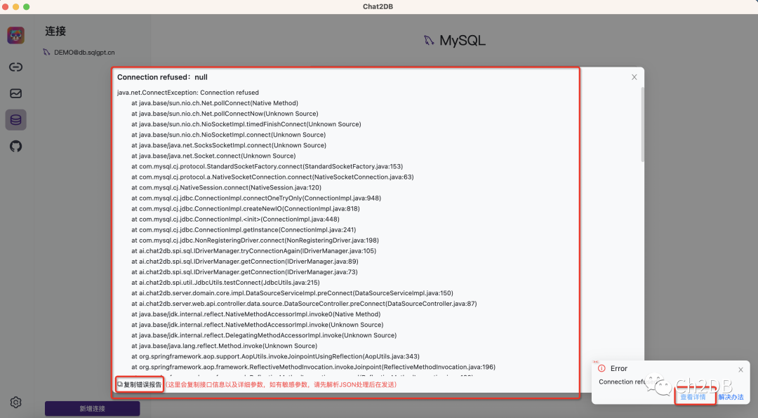 如果仍然无法解决,查看详情后可以复制错误信息,在 GitHub 提交 issue,所有 issue 我们都会去看,提交 issue 是最有效的解决办法。