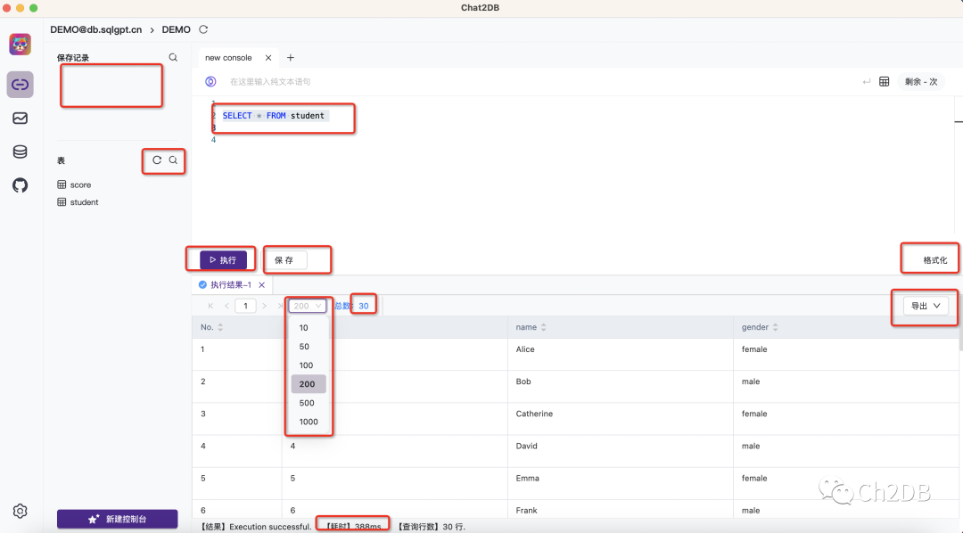 1、选中SQL,点击执行按钮,可以执行SQL。控制台下方会显示执行结果,可以分页查看结果,也可以导出结果。2、选中SQL,点击格式化按钮,可以格式化SQL。3、点击控制台保存按钮,可以保存SQL到本地,在左侧我的保存可以查看保存记录,下次打开可以直接打开。