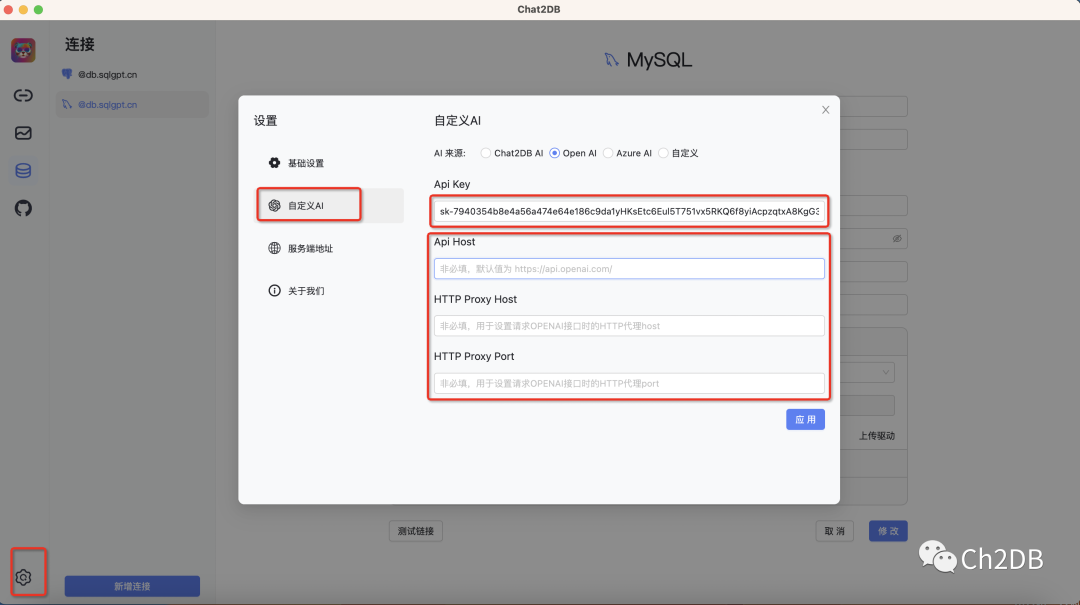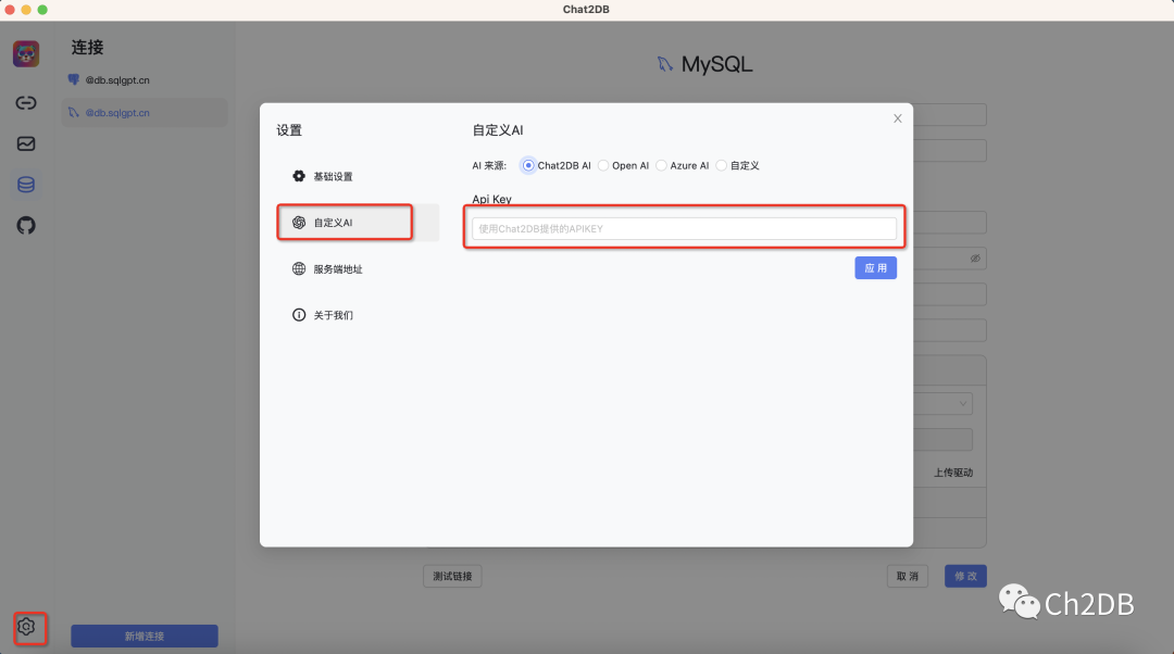 点击左下角设置--》自定义AI--> Chat2DB AI,输入AI Key,点击保存即可。