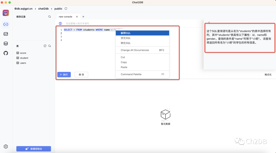 选中 SQL 右键 解释SQL,在右侧弹窗中 AI 即可对 SQL 解释生成内容。