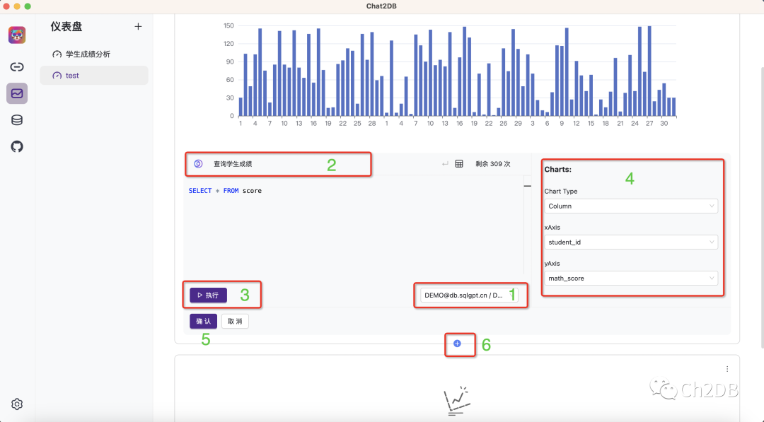 - 1、当前卡片选择数据源,可以选择已经连接的数据库。- 2、输入该报表要查询的数据,AI 开始生成 SQL。- 3、点击执行按钮返回数据格式。- 4、选择报表格式,x坐标 y坐标。- 5、点击保存卡片。- 6、点击卡片下方"+"号,在当前报表继续添加卡片,步骤同上。