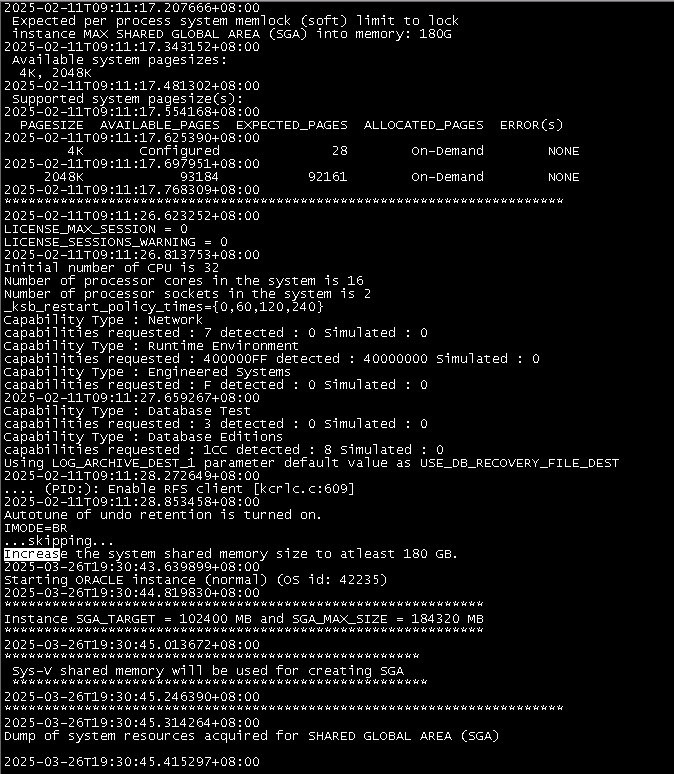 查alter日志得出由于sga_max 设置为180GB, 报Increase the system shared memory size to atleast 180 GB,所以shmmax的值需设置大于180GB。