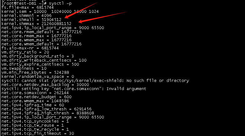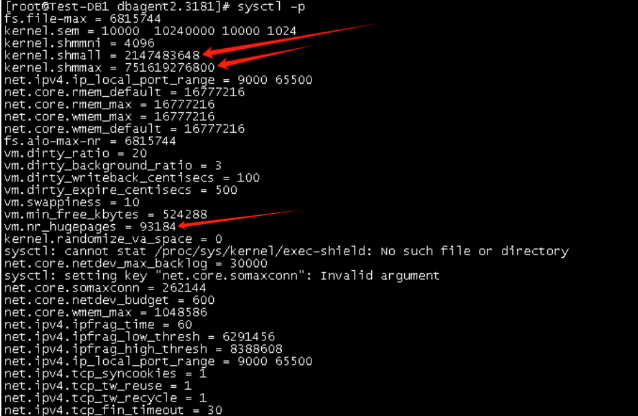 查看内核参数,发现shmmax,shmall设置不合理,同时还开启大页内存nr_huggepages。