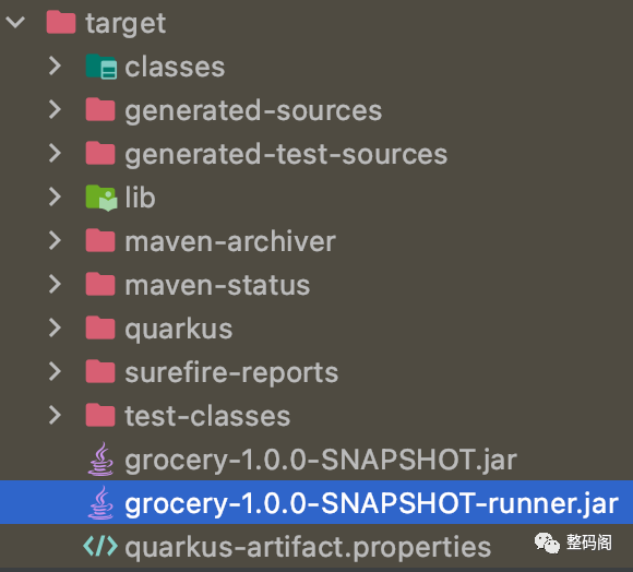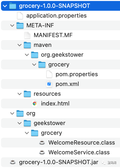 quarkus-app是核心目录,编译后的代码打包在app下的grocery-1.0.0-SNAPSHOT.jar,该文件在target根目录也有一份。项目依赖在lib目录,项目可执行文件在quarkus目录,最后quarkus-run.jar是可执行文件。所以部署项目必须拷贝整个quarkus-app目录。Fast Jar模式将可执行文件和依赖相分离,它通过依赖索引(quarkus-app-dependencies.txt)加载依赖,避免遍历所有jar包,所以启动速度快,消耗内存少。将grocery-1.0.0-SNAPSHOT.jar解压后如下图,可以看到它仅包含java类和资源文件,不包含依赖,所以不能直接运行。java -jar target/quarkus-app/quarkus-run.jar