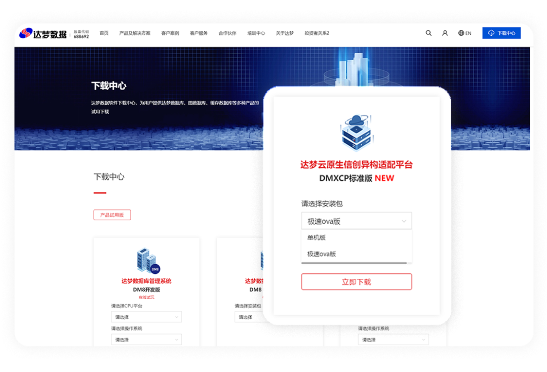 仅需点击【立即下载】,注册登录官网账号,即可免费下载达梦云原生信创异构适配平台,单机标准版和极速 ova 版,两款安装包任意选择,包含配套的《达梦云原生信创异构适配平台单机标准免费版部署说明》、《达梦云原生信创异构适配平台ova版部署说明 》,享有开箱即用的仿真实验环境。 极速试用,简单快捷,体验更流畅。