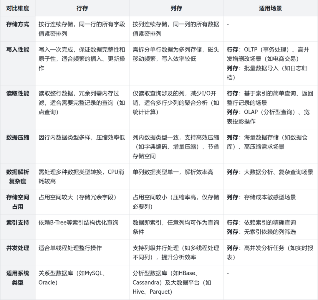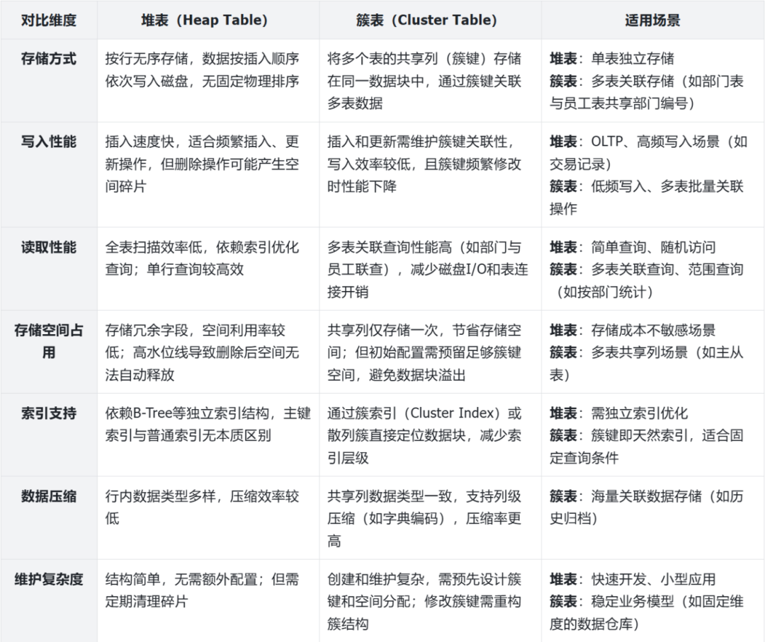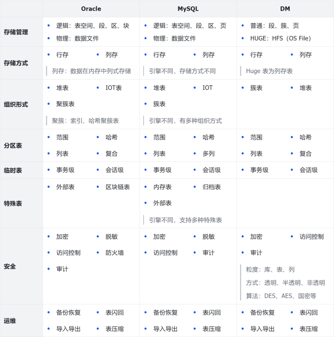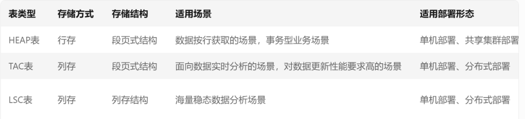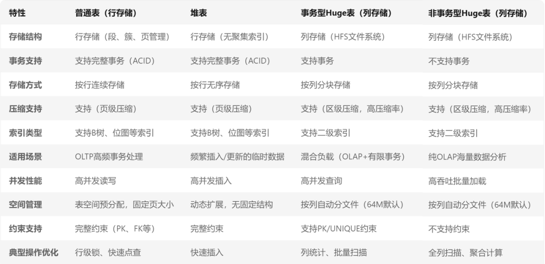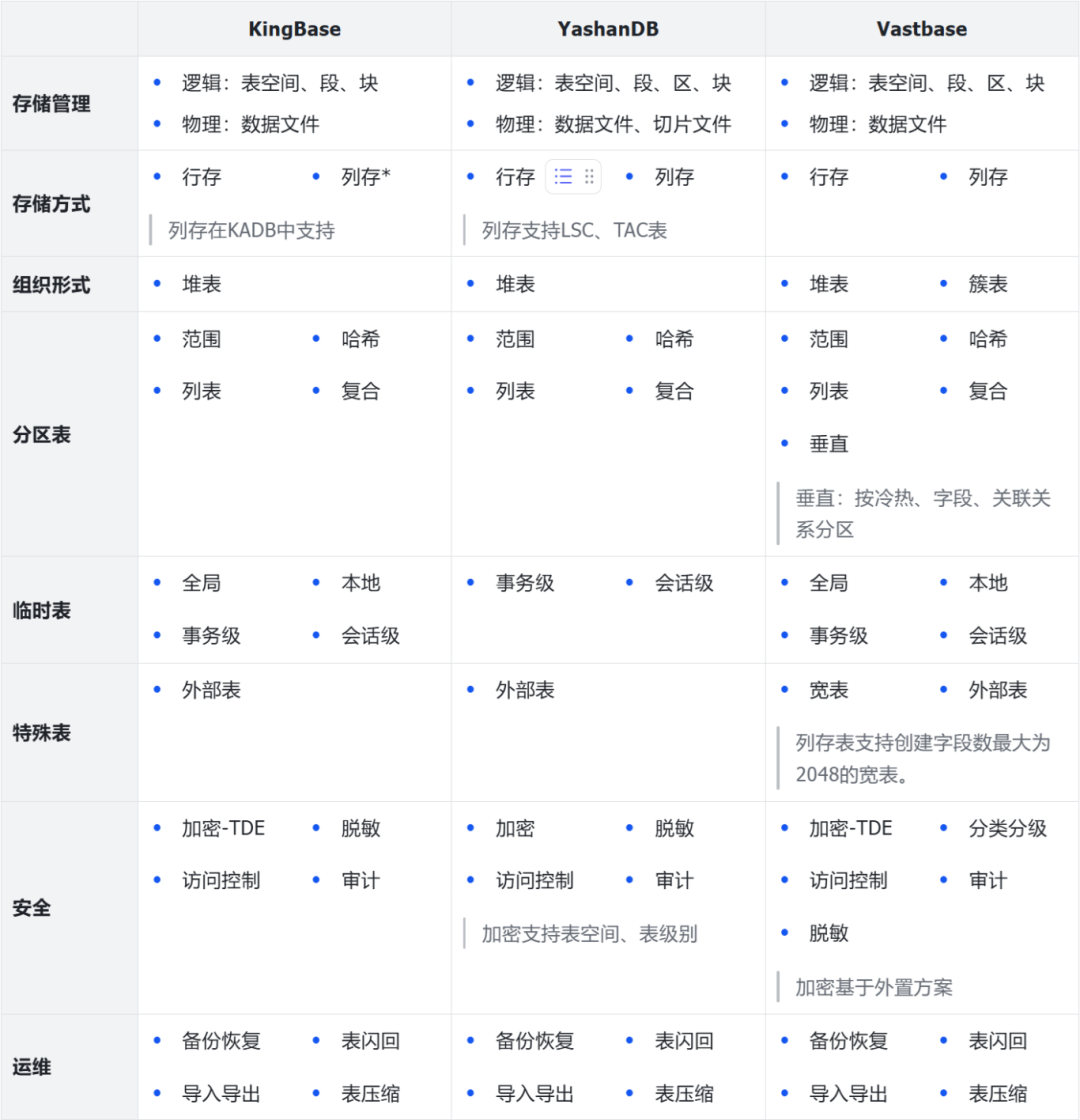 先来看看各家数据库产品在表能力的大致表现如何。限于宽度,这里拆分为两个表格。
