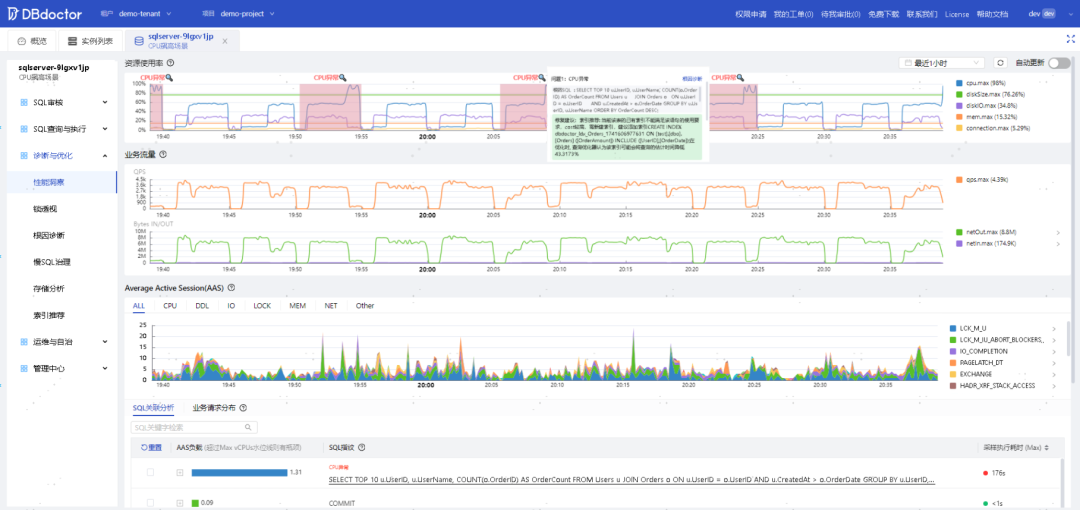 通过数学模型精准定位,打破基于经验、规则、阈值诊断的传统,真正实现单条SQL资源量化,把资源消耗映射为颜色面积,直观定位数据库性能问题并给出优化建议(比如索引推荐)。包含资源使用率、业务流量、Average Active Session(AAS即平均活跃会话)曲线,同屏展示三者的关联关系,三步即可快速定位性能问题。