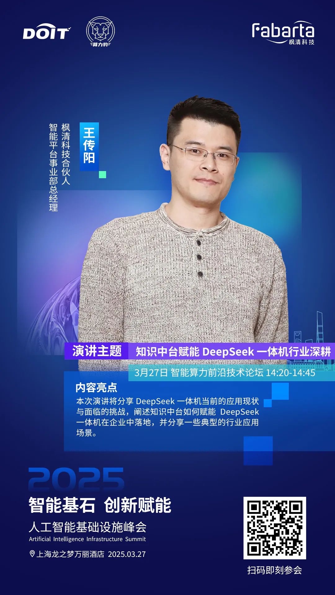 3月27日,枫清科技合伙人、智能平台事业部总经理王传阳将作为重磅嘉宾在大会“智能算力前沿技术论坛”发表精彩演讲。深入探讨知识中台如何赋能 DeepSeek 一体机在企业中的落地应用,并分享典型的行业应用场景,敬请期待。