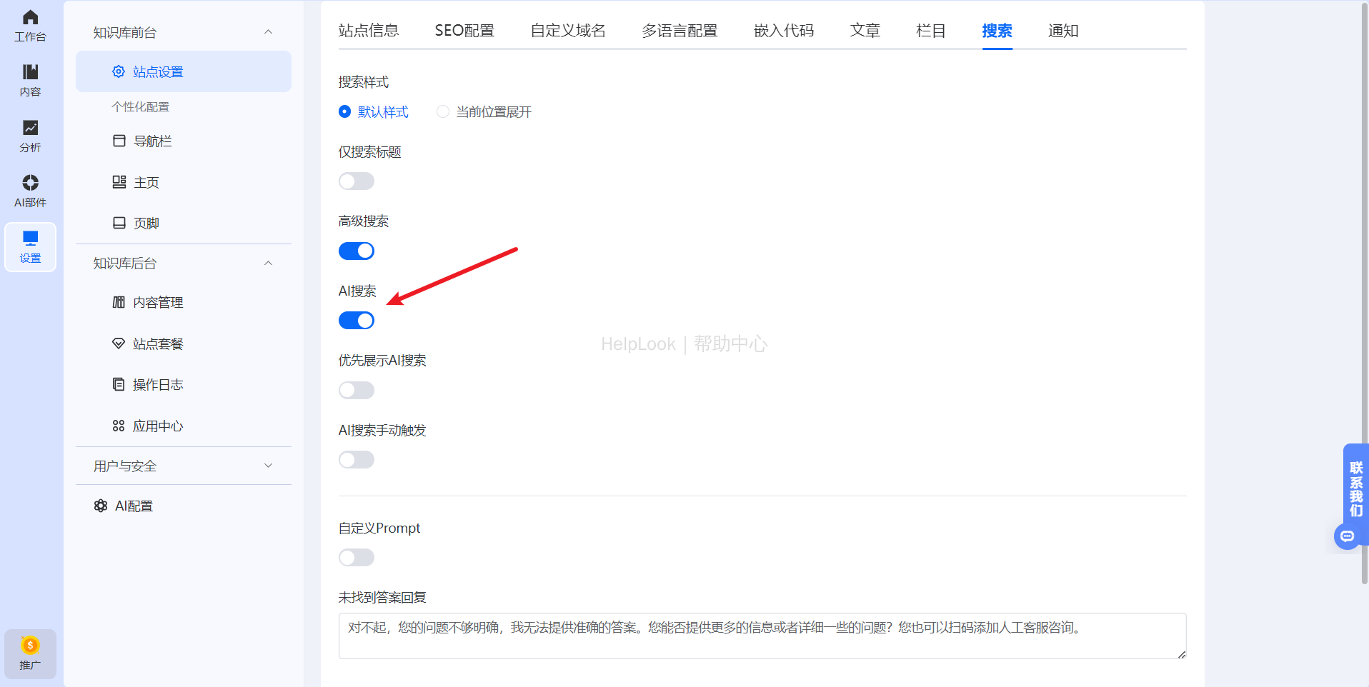 AI智能搜索:AI智能搜索功能通过自然语言处理(NLP)和主流AI大模型(如DeepSeek、文心一言、ChatGPT、豆包等)的结合,能够快速理解用户意图并提供精准的搜索结果。用户只需输入关键词或问题,AI即可基于知识库内容,自动整理出相关答案和内容索引,显著提高检索效率。