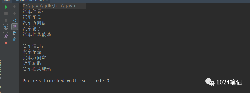 package com.jiangxia.BuilderPattern;/*** @Author: 江夏* @Date: 2021/10/28/22:07* @Description:*/public class BuildPatternTest {public static void main(String[] args) {AbstractCarBuild abstractCarBuild = new ConcreteCarBuild1();CarDirector carDirector = new CarDirector(abstractCarBuild);CarProduct carProduct = carDirector.build();System.out.println("汽车信息:");System.out.println(carProduct.getHood());System.out.println(carProduct.getSteeringWheel());System.out.println(carProduct.getWheel());System.out.println(carProduct.getWindshield());System.out.println("========================");carDirector.setAbstractCarBuild(new ConcreteCarBuild2());CarProduct truckProduct = carDirector.build();System.out.println("货车信息:");System.out.println(truckProduct.getHood());System.out.println(truckProduct.getSteeringWheel());System.out.println(truckProduct.getWheel());System.out.println(truckProduct.getWindshield());}}