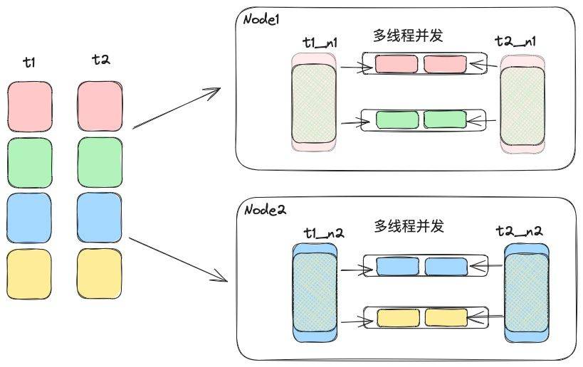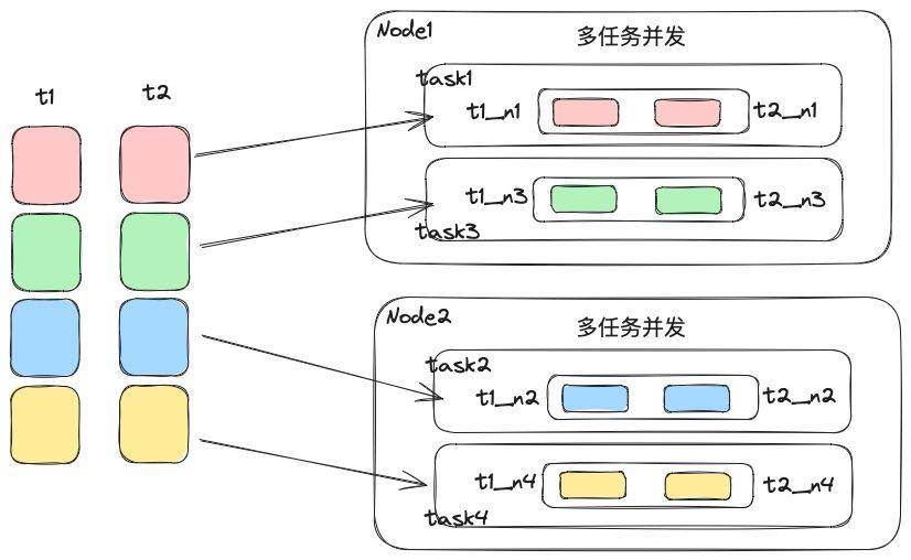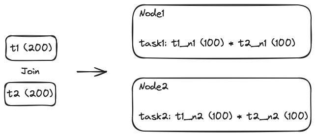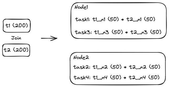 以两张Hash表的Join为例,计算节点数为2,两张表分别有200行数据。默认情况下,把两张表的部分数据分别发给两个计算节点,做分片对分片的关联。每个节点上的关联的数据量是 100 * 100 。使用了多分片并行计算后,可以调整每个计算节点的任务数为2 。这样节点上每个任务关联的数据量就是 50 * 50 。整体看使用多分片后降低了关联的数据量。