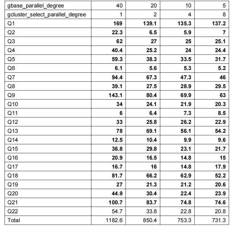 在gcluster_select_parallel_degree分别取值为1、2、4和8 这四种场景下,分别执行tpch 1t的测试。获取并比较四种场景的执行计时,结果如下。