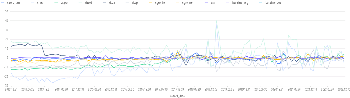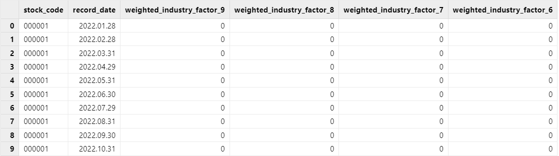 | getIndusrtyFactor | 获取加权后的行业因子 步骤一:getIndustry 获取原始行业因子。 步骤二:getIndusrtyWeighted 获取行业权重。 |