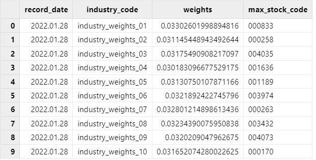 | getIndusrtyWeighted | 获取行业因子权重 步骤一:获取月末交易日和行业交易代码。 步骤二:基于交易日数据获取各行业数据、市场数据。步骤三:关联上述两表,计算每个行业占总行业的权重,并找出在指定行业中占比最大的个股。 |